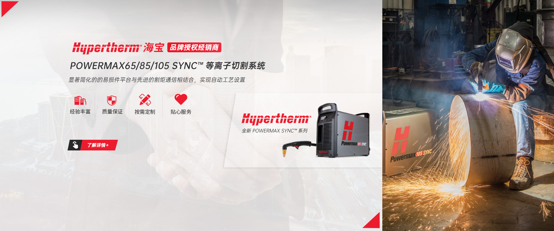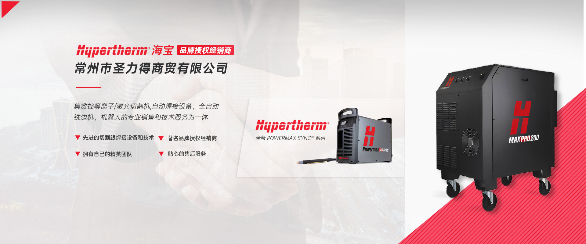 常州市圣力得商贸有限公司是一家集数控等离子/激光切割机,自动焊接设备,全自动铣边机,机器人的专业销售和技术服务为一体的公司。本公司是世界品牌Hypertherm(美国海宝)公司的授权经销商。 公司是一支技术稳定、服务优良、富有朝气的精英团队。公司致力于将国外先进的切割跟焊接设备和技术介绍给中国的机器制造商和终端用户,并为用户提供品质的产品和完善的售后服务?! 」局饕硪韵虏罚骸 ?.美国海宝Hypertherm等离子机用电源,手持电源,原装易损件及备件 2.韩国赛拉科(CERACO)铣边机,南京顶瑞自动焊接小车 3.迈誓坦(MicroStep),日本田中(TANAKA),武汉法利莱(FARLEY-LASERLAB),江苏博大品牌等离子切割机,激光切割机及维修配件?! ?.美国海宝,美国飞马特,凯尔贝等原装正品易损件及配件 5.激光切割机,等离子切割机,火焰切割机升级,安装与调试及技术升级改造项目 6.机器人焊/切生产线 热忱欢迎广大用户前来询价及洽谈。
